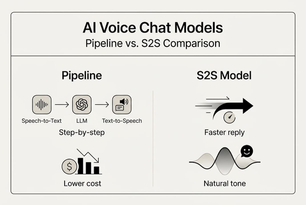 The choice between pipeline and S2S is not about which is better in the abstract. It's about which fits your constraints. S2S latency is typically under 300ms, roughly 4x faster than pipelines at 1.1 seconds, but S2S costs run about 10x higher in token usage. That's a real trade-off for high-volume applications.