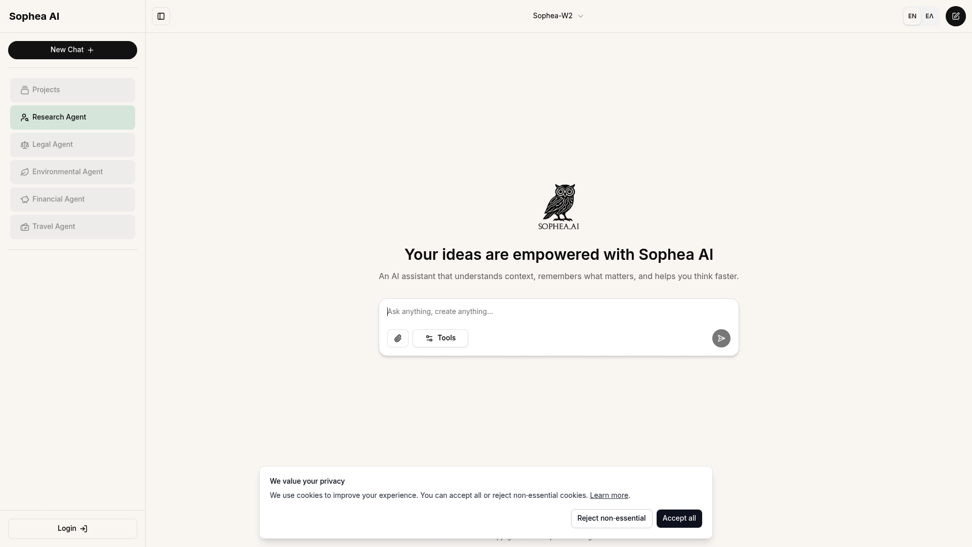 Sophea AI provides context understanding and memory retention, a suite of specialized research agents for legal, environmental, financial, and travel domains, and support for project based workflows. The product also highlights user privacy with customizable cookie controls and clear privacy messaging.